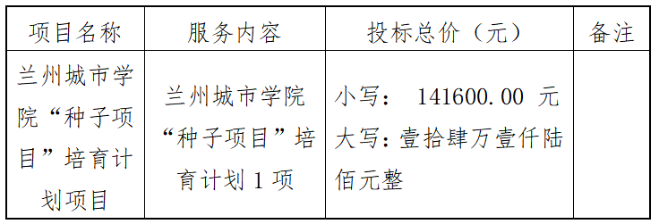 甘肃安宇工程造价咨询有限公司受beat365官方网站的委托,对beat365官方网站“种子项目”培育计划项目以公开招标的方式进行采购,评标小组于2024年7月19日确定中标结果。现将中标结果公布如下: