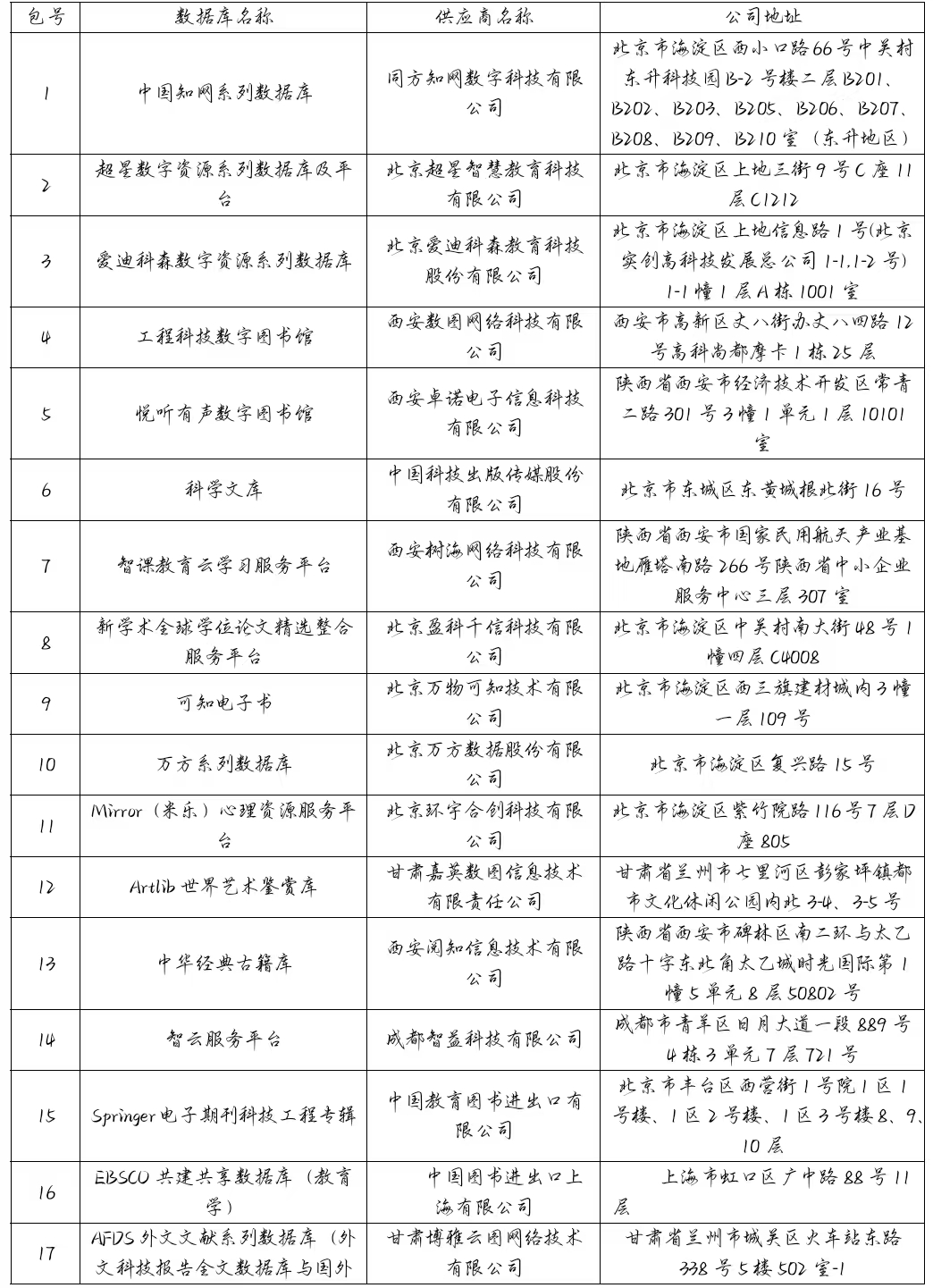 拟采购的货物或服务的说明:beat365官方网站图书馆数字资源建设项目,本次采购20个中外文数字资源数据库,包含中国知网系列数据库、超星数字资源系列数据库及平台、爱迪科森数字资源系列数据库、工程科技数字图书馆、悦听有声数字图书馆、科学文库、智课教育云学习服务平台、新学术全球学位论文精选整合服务平台、可知电子书、万方系列数据库、Mirror(米乐)心理资源服务平台、Artlib世界艺术鉴赏库、中华经典古籍库、智云服务平台、Springer电子期刊科技工程专辑、EBSCO共建共享数据库(教育学)、AFDS外文文献系列数据库(外文科技报告全文数据库与国外学术会议全文数据库)、掌阅精选—数字阅读平台、51CTO学堂、起点考研网。本项目拟采购的货物或服务的最高限价为250万元。