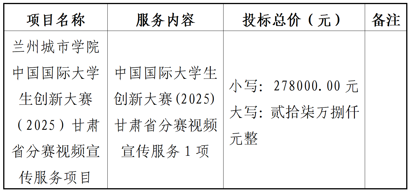 甘肃安宇工程造价咨询有限公司受beat365官方网站的委托,对“beat365官方网站中国国际大学生创新大赛(2025)甘肃省分赛视频宣传服务项目”以公开招标的方式进行采购,评标小组于2025年05月19日确定中标结果。现将中标结果公布如下:
