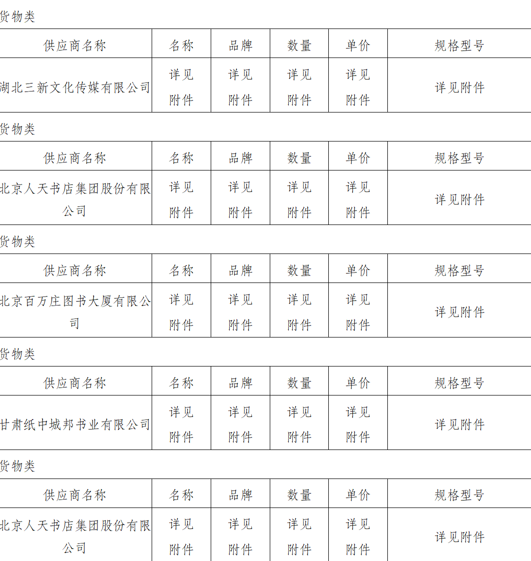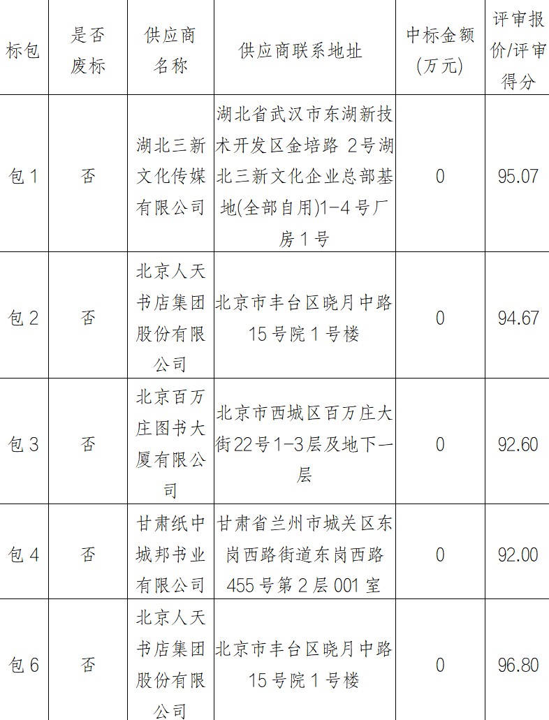 第一包中标供应商:湖北三新文化传媒有限公司,中标下浮率:32%;第二包中标供应商:北京人天书店集团股份有限公司,中标下浮率:32%;第三包中标供应商:北京百万庄图书大厦有限公司,中标下浮率:34%;第四包中标供应商:甘肃纸中城邦书业有限公司,中标下浮率:34%;第五包有效供应商不足三家,故废标;第六包中标供应商:北京人天书店集团股份有限公司,中标下浮率:20%。