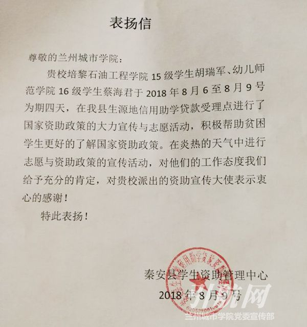 秦安县学生资助管理中心的表扬信