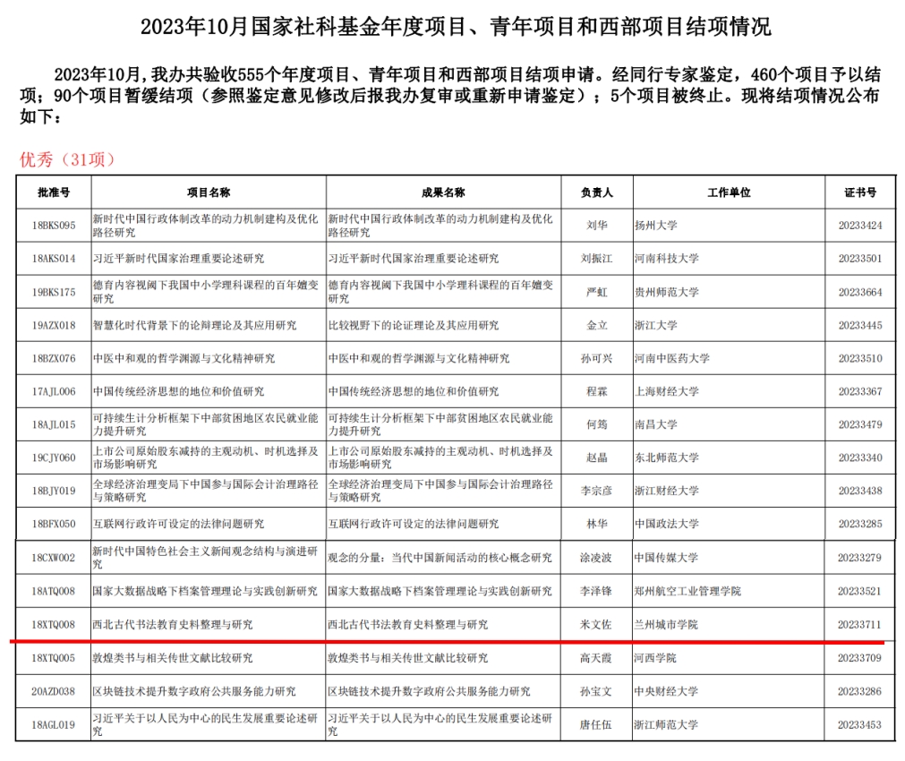 近日,全国哲学社会科学工作办公室公布了2023年10月国家社科基金项目结项情况,beat365文史学院教授、甘肃张芝书法院负责人米文佐主持的《西北古代书法教育史料整理与研究》(批准号18XTQ008)顺利结项,结项等级“优秀”,这是beat365承担的国家社科基金项目结项首次获得“优秀”等级。