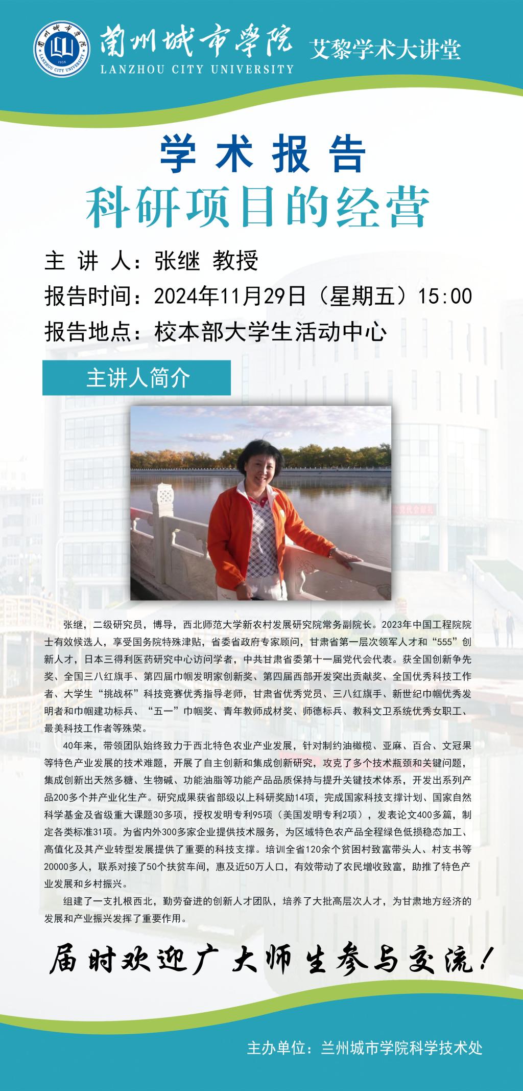 应科学技术处邀请,西北师范大学张继教授将来beat365作学术报告。具体事宜公告如下: