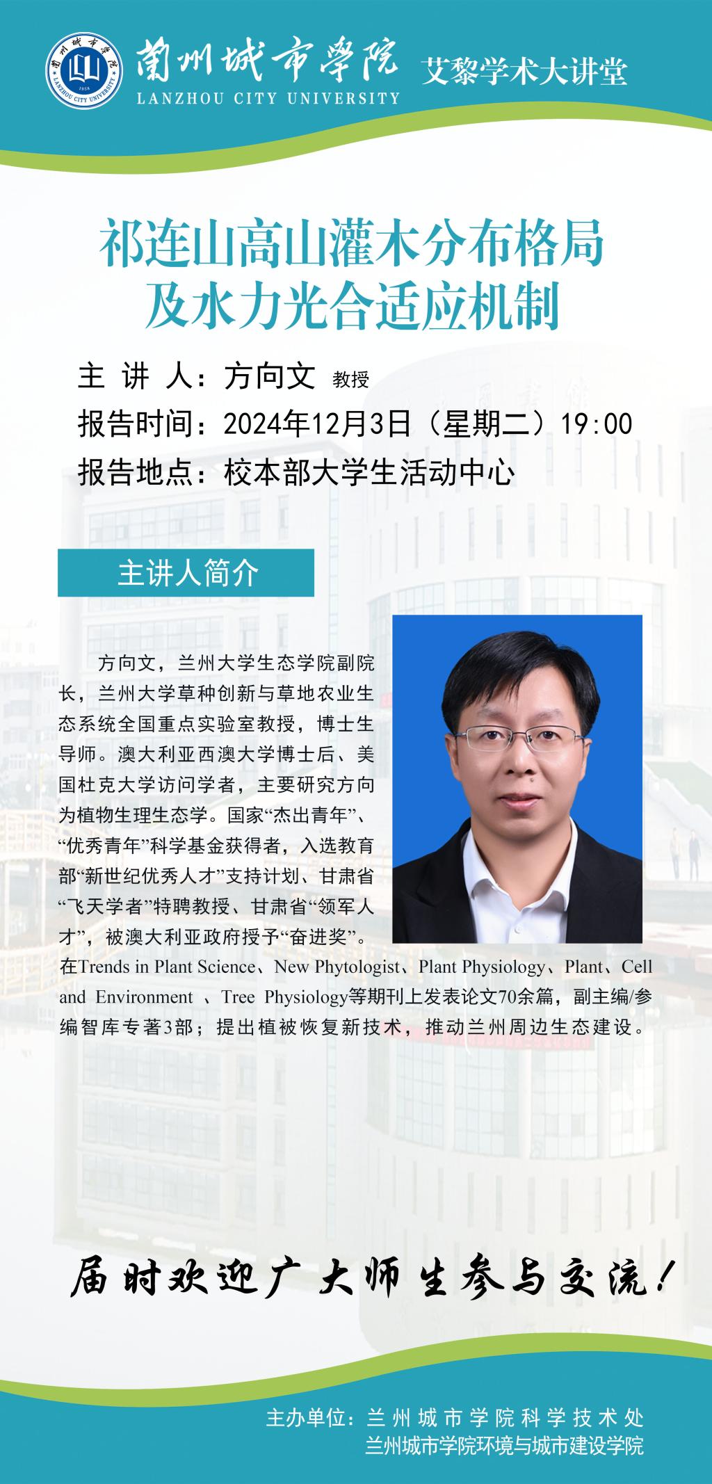 应科学技术处和环境与城市建设学院联合邀请,兰州大学方向文教授将来beat365作学术报告。具体事宜公告如下: