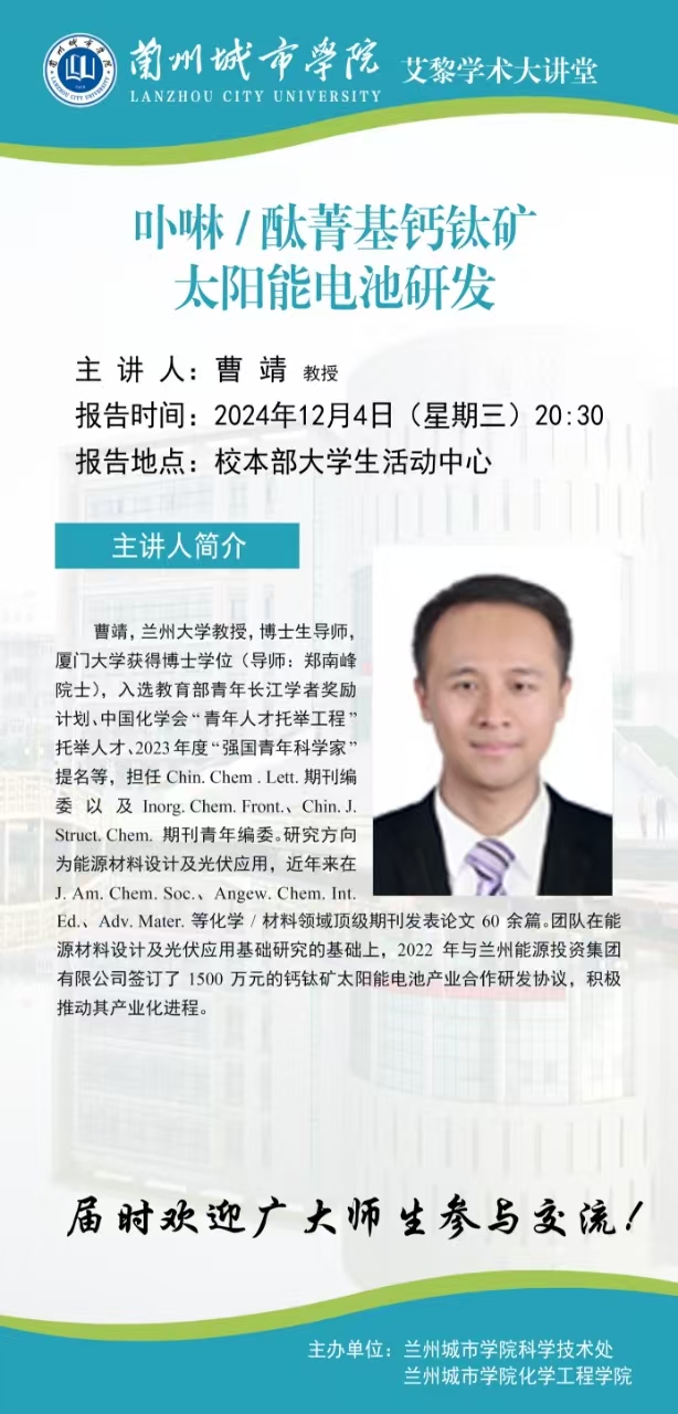 应科学技术处和化学工程学院联合邀请,兰州大学曹靖教授将来beat365作学术报告。具体事宜公告如下: