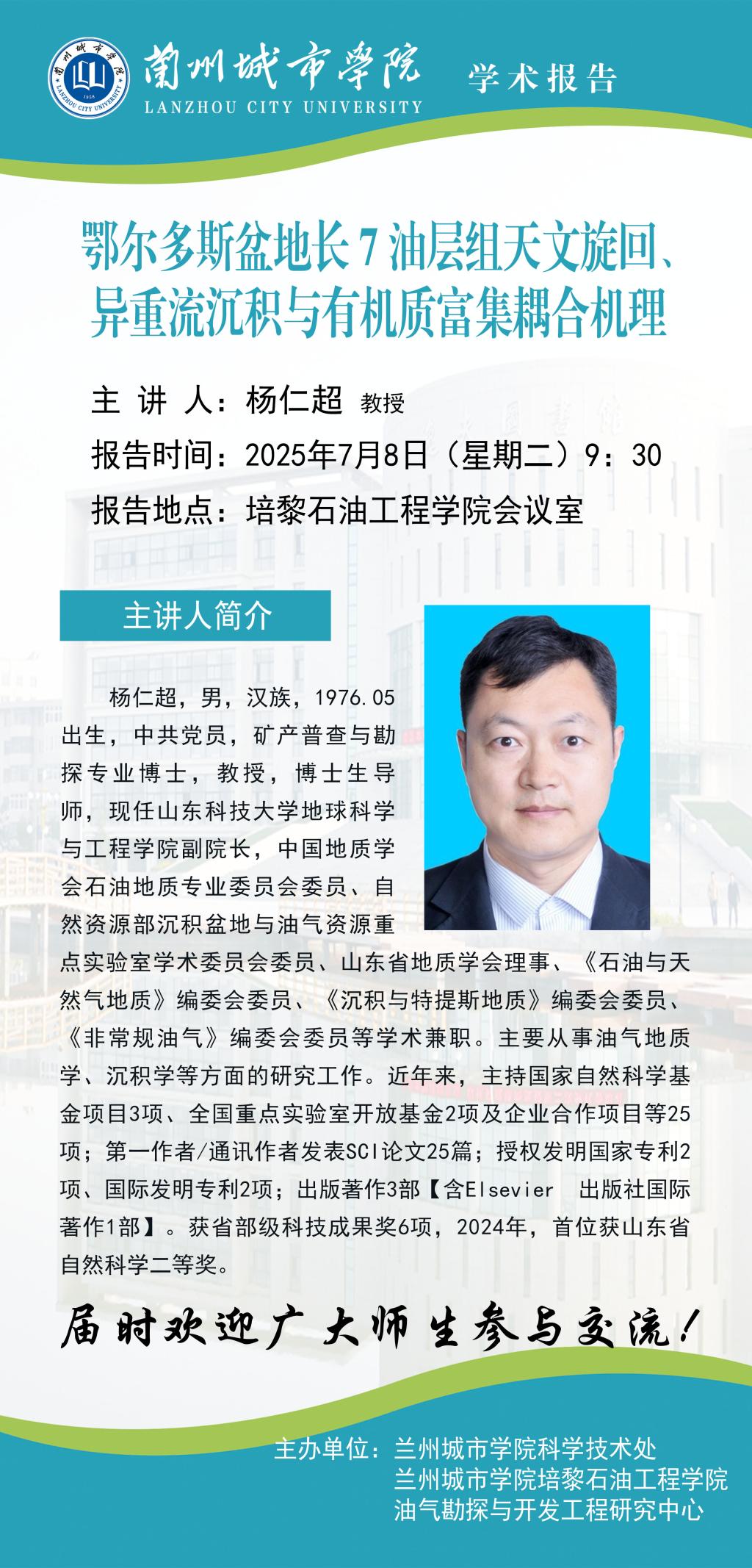 应科学技术处、培黎石油工程学院和油气勘探与开发工程研究中心联合邀请,山东科技大学杨仁超教授将为beat365作学术报告。具体事宜公告如下: