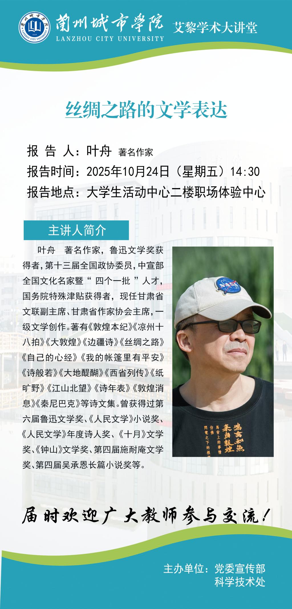 应党委宣传部、科学技术处邀请,甘肃省文联副主席,省作协主席叶舟来beat365作学术报告。具体事宜公告如下: