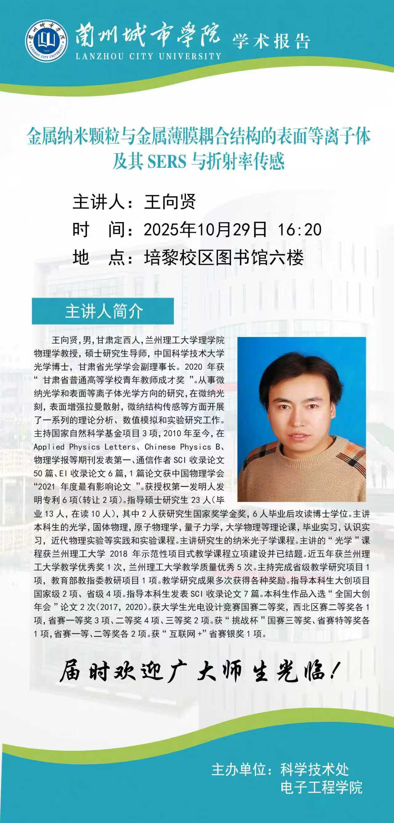 王向贤,男,汉族,甘肃定西人,兰州理工大学理学院物理学教授,硕士研究生导师,中国科学技术大学光学博士,硕士研究生导师,甘肃省光学学会副理事长。2020年获“甘肃省普通高等学校青年教师成才奖”。从事微纳光学和表面等离子体光学方向的研究,在微纳光刻,表面增强拉曼散射,微纳结构传感等方面开展了一系列的理论分析、数值模拟和实验研究工作。主持国家自然科学基金项目3项,2010年至今,在Applied Physics Letters、Chinese Physics B、物理学报等期刊发表第一、通信作者SCI收录论文50篇、EI收录论文6篇,1篇论文获中国物理学会“2021年度最有影响论文”。获授权第一发明人发明专利6项(转让2项)。指导硕士研究生23人(毕业13人,在读10人),其中2人获研究生国家奖学金奖,6人毕业后攻读博士学位。主讲本科生的光学,固体物理,原子物理学,量子力学,大学物理等理论课,毕业实习,认识实习,近代物理实验等实践和实验课程。主讲研究生的纳米光子学课程。主讲的“光学”课程获兰州理工大学2018年示范性项目式教学课程立项建设并已结题。教学深受师生的一致肯定和好评,近五年获兰州理工大学教学优秀奖1次,兰州理工大学教学质量优秀5次。主持完成省级教学研究项目1项,教育部教指委教研项目1项。教学研究成果多次获得各种奖励。指导本科生大创项目国家级2项、省级4项。指导本科生发表SCI收录论文7篇。本科生作品入选“全国大创年会”论文2次(2017,2020)。获大学生光电设计竞赛国赛二等奖,西北区赛二等奖各1项,省赛一等奖3项、二等奖4项、三等奖2项。获“挑战杯”国赛三等奖、省赛特等奖各1项,省赛一等、二等奖各2项。获“互联网+”省赛银奖1项。