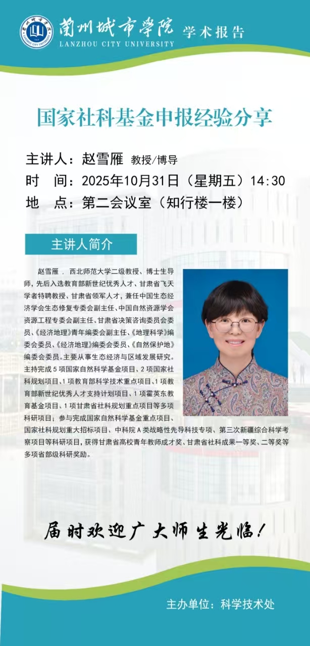 赵雪雁,西北师范大学二级教授、博士生导师,先后入选教育部新世纪优秀人才、甘肃省飞天学者特聘教授、甘肃省领军人才,兼任中国生态经济学会生态修复专委会副主任、中国自然资源学会资源工程专委会副主任、甘肃省决策咨询委员会委员、《经济地理》青年编委会副主任、《地理科学》编委会委员、《经济地理》编委会委员、《自然保护地》编委会委员。主要从事生态经济与区域发展研究。主持完成5项国家自然科学基金项目、2项国家社科规划项目、1项教育部科学技术重点项目、1项教育部新世纪优秀人才支持计划项目、1项霍英东教育基金项目、1项甘肃省社科规划重点项目等多项科研项目;参与完成国家自然科学基金重点项目、国家社科规划重大招标项目、中科院A类战略性先导科技专项、第三次新疆综合科学考察项目等科研项目,获得甘肃省高校青年教师成才奖、甘肃省社科成果一等奖、二等奖等多项省部级科研奖励。