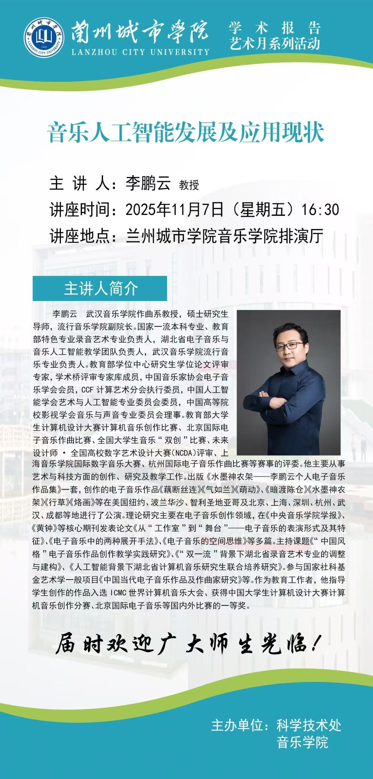 应科学技术处、音乐学院联合邀请武汉音乐学院作曲系教授、硕士研究生导师、流行音乐学院副院长李鹏云来beat365作学术讲座