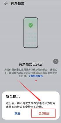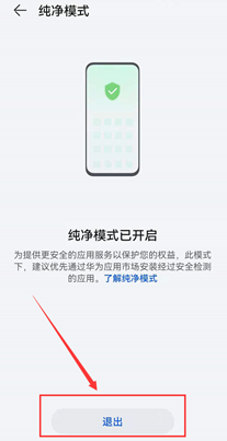 (3)进入纯净模式,点击“退出”→“依然退出”即可,安装APP再无限制。