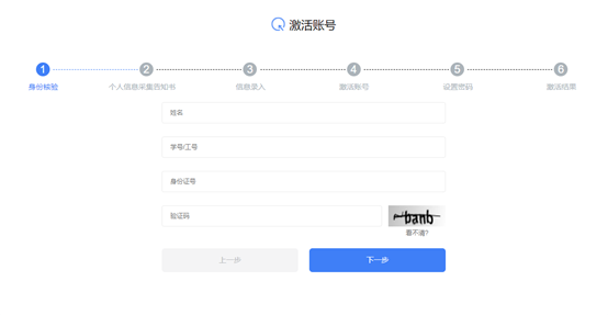 第二步:在账号激活页面输入姓名、工号(学号)、身份证号、验证码等信息,点击下一步。
