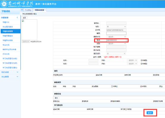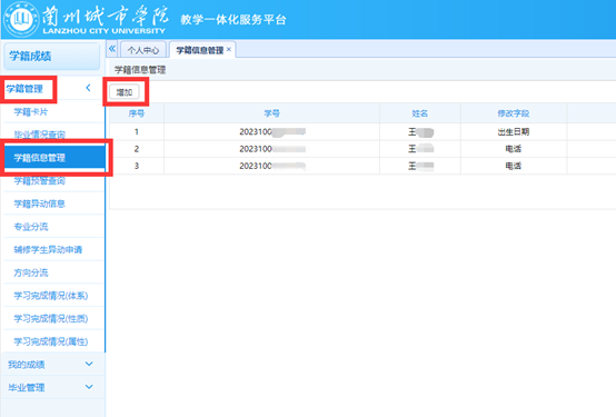 注意:学生用户需先登录教务管理系统(http://jwgl.lzcu.edu.cn/jsxsd/),在“学籍成绩”-“学籍管理”-“学籍信息管理”里点击“增加”,录入自己的出生日期和手机号后保存成功,输入手机号前后不要有空格。等待3分钟,数据同步到统一身份认证平台后进行激活操作。