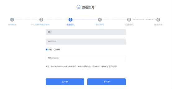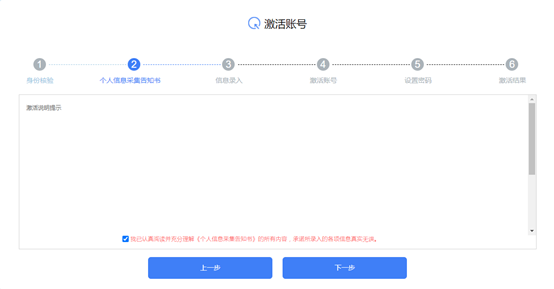 第三步:在激活页面中勾选“我已认真阅读并充分理解《个人信息采集告知书》的所有内容,承诺所录入的各项信息真实无误”,点击下一步。