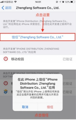 下载完成后,点击App图标,IOS9之前的操作系统版本会弹出是否信任的对话框,选择【信任】,之后就可以使用了。