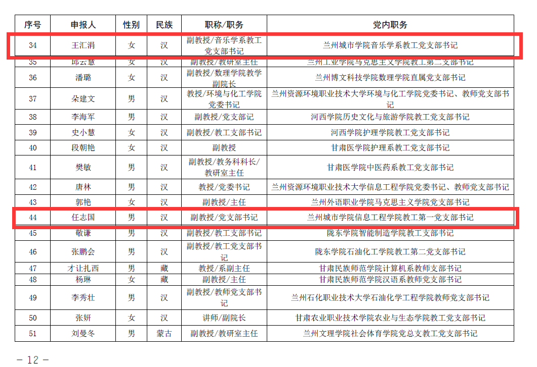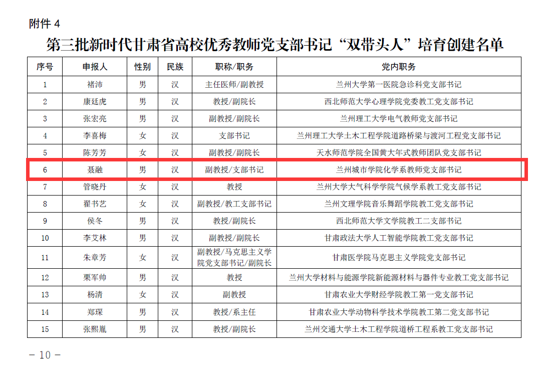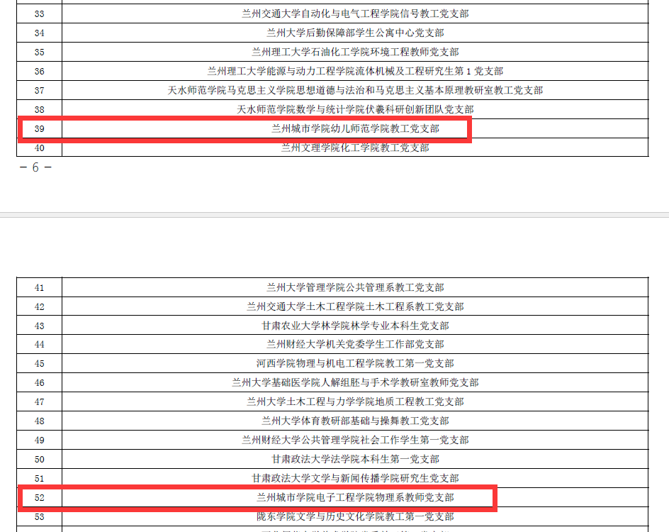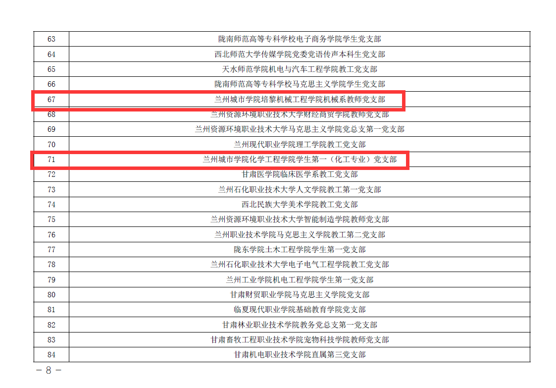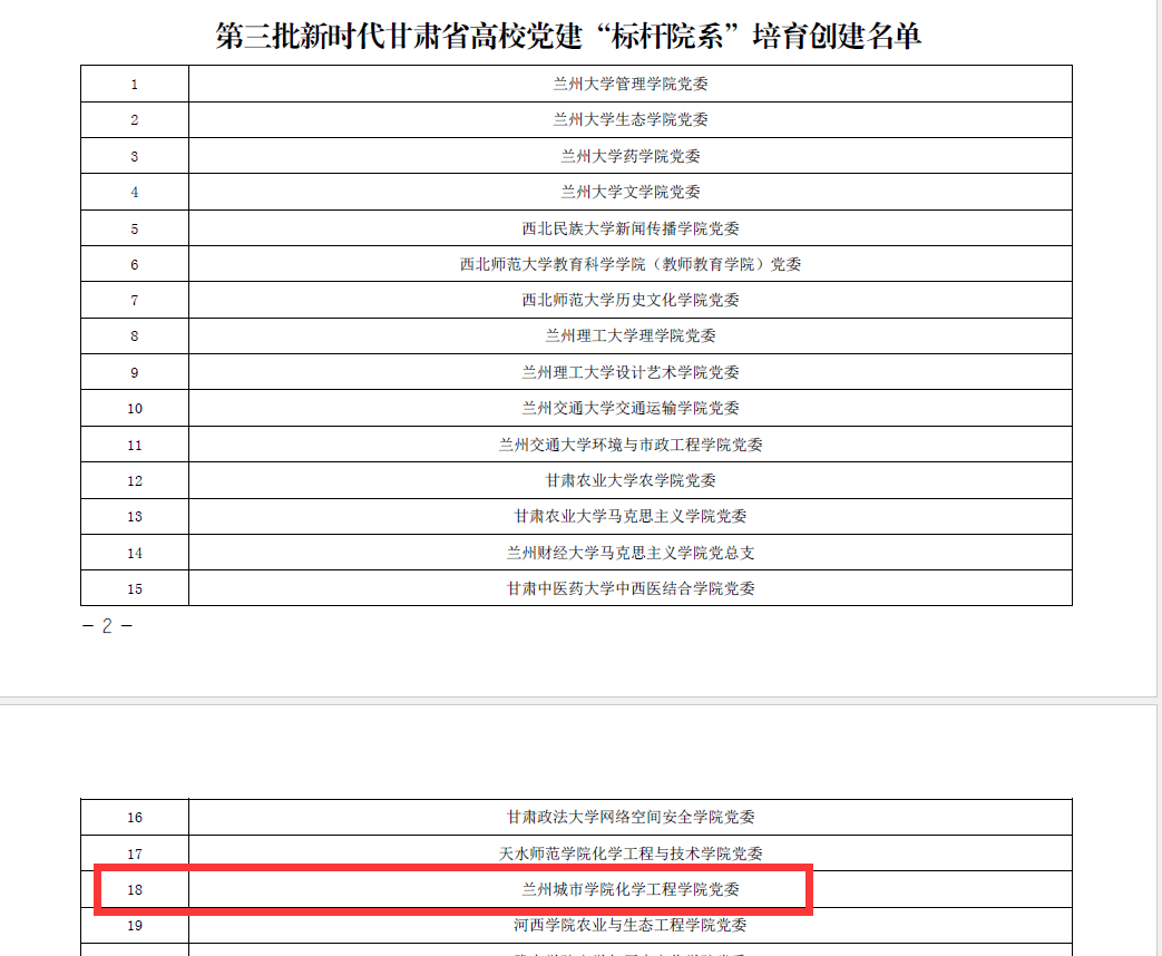 近日,中共甘肃省委教育工作委员会印发了《关于公布第三批新时代甘肃省大中小学党建“对标争先” 培育创建单位名单的通知》。beat365化学工程学院党委被列入“标杆院系”培育创建名单;幼儿师范学院教工党支部、电子工程学院物理系教师党支部、培黎机械工程学院机械系教师党支部、化学工程学院学生第一(化工专业)党支部等4个党支部被列入“样板党支部”培育创建名单;化学系教师党支部书记聂融、音乐学系教工党支部书记王汇涓、信息工程学院教工第一党支部书记任志国等3名支部书记被列入优秀教师党支部书记“双带头人”培育创建名单。