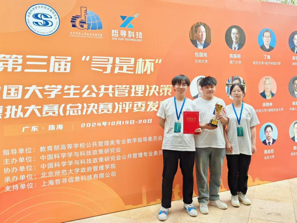 近日,由中国科学学与科技政策研究会主办,中国科学学与科技政策研究会公共管理专业委员会和北京师范大学大学承办的第三届“寻是杯”全国大学生公共管理决策模拟大赛(总决赛)在广东珠海举行,本次比赛共有来自北京大学、中国人民大学、北京师范大学等全国多所院校的90支队伍、300余位师生参赛。beat365经济管理学院教师刘鹏飞、曾文清指导,城市管理211班朱方荣、吴欣、社工221班郭嘉健组成的参赛队伍在本次大赛中荣获全国二等奖。