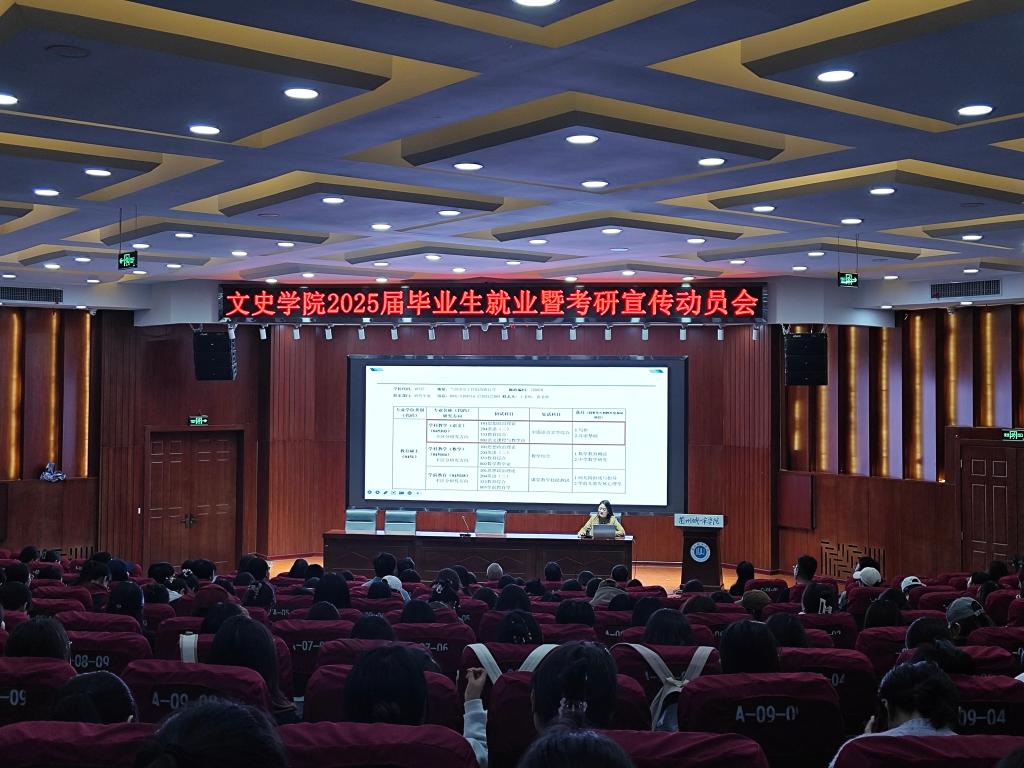 为扎实推进毕业生就业和考研工作,助推 2025 届毕业生实现更充分、更高质量的就业,10 月 9 日下午,文史学院在大学生活动中心召开2025 届毕业生就业暨考研宣传动员会。学院党政领导班子、毕业班班主任、全体辅导员以及 2025 届全体毕业生共同参与了此次会议。会议由学院党委负责人主持。