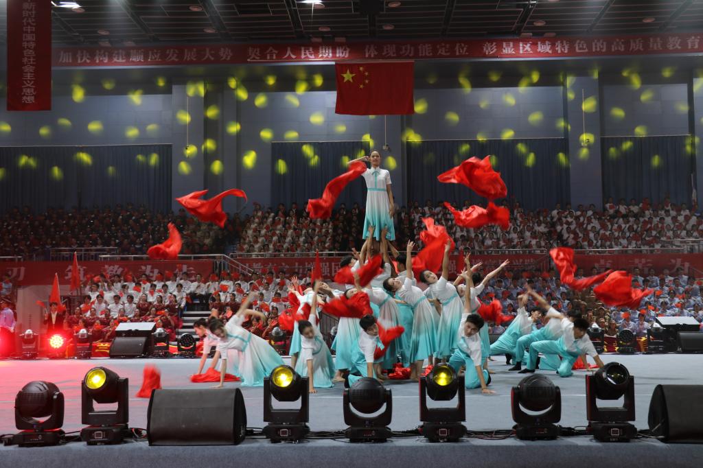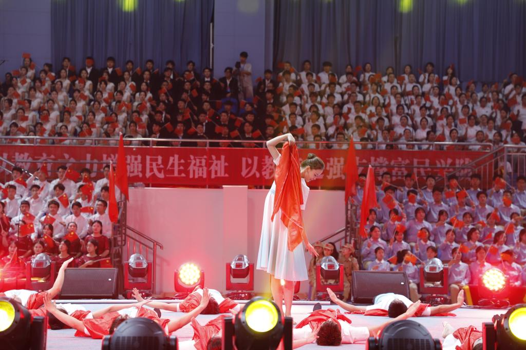 音乐学院师生歌伴舞《没有共产党就没有新中国》作品在第一篇章《星火燎原》作为开场节目进行表演,震撼全场。《没有共产党就没有新中国》展现了在历史长河中,中国曾在黑暗中徘徊,国家蒙难、文明蒙尘。是中国共产党,如一盏明灯,照亮了前行的道路;如一座灯塔,为中华民族的伟大复兴指引着方向。历史充分证明:没有共产党就没有新中国。同学们挥动手中的国旗,用最嘹亮的歌声与最热情的舞蹈,回顾党的光辉历程,唱响百年岁月荣光,深情讴歌党的丰功伟绩,唱出了兰城院师生对党的无限崇敬与感恩,对祖国的无限赞美与热爱。