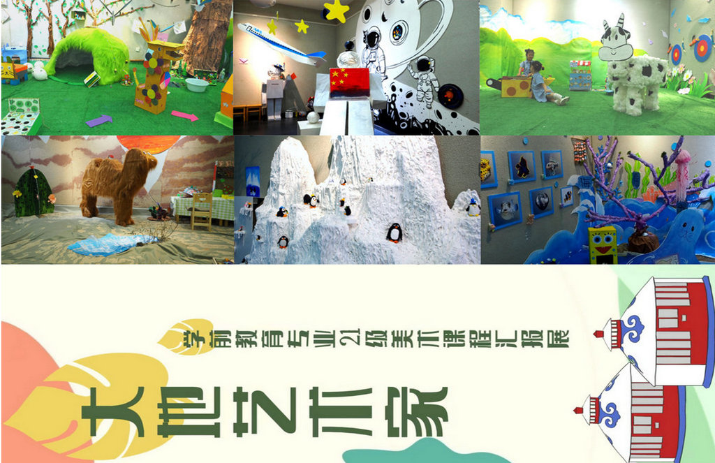 本次展览的形式为空间综合布置,教师与学生结合幼儿园教育环境创设的理论与实践需求,确定“大地艺术家”主题,分“冰雪世界”“海洋之韵”“大漠风光”“星空奇境”“青青草原”“森林王国”六个子主题板块,整个汇报展从策划、材料选用、布展及海报设计均由学生完成,学生按个人意愿选择子主题板块,体现学生中心理念。汇报展的环境创设坚持童趣化、探究性、趣味性原则,引导学前教育专业学生从儿童视角出发,充分挖掘幼儿园环境的教育价值,努力为幼儿创设“够得着、看得懂、能互动”的学习生活空间。