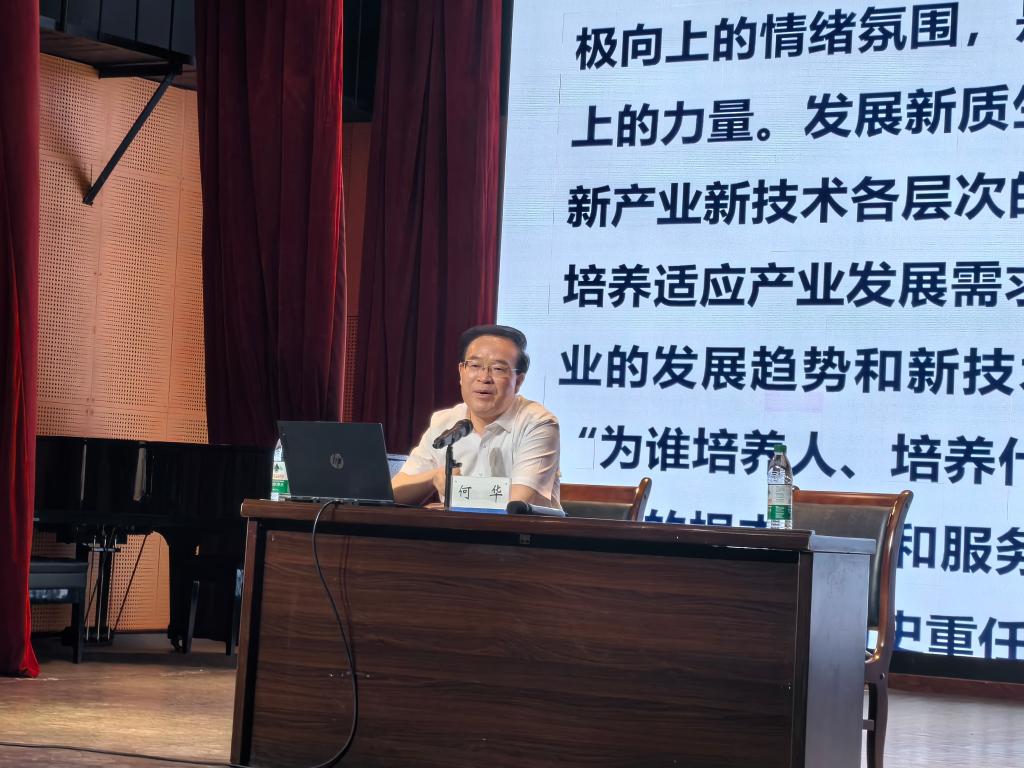 何华以《策其源 秉其魂 践其行 着力推进课程思政走深走实》为题,以新质生产力的实质内涵、习近平文化思想形成的时代意义、学校文化的时代表达为切入点,指出思政教育要把握中国式课程思政的时代焦点,理解大思政课的核心理念,坚持显性教育和隐性教育相统一,加强专业知识与思政教育融合,把对人本身的关怀融入到每一门课程的教学之中,让课程真正承载起育人的功能,实现“三全育人”,培养担当民族复兴大任时代新人。