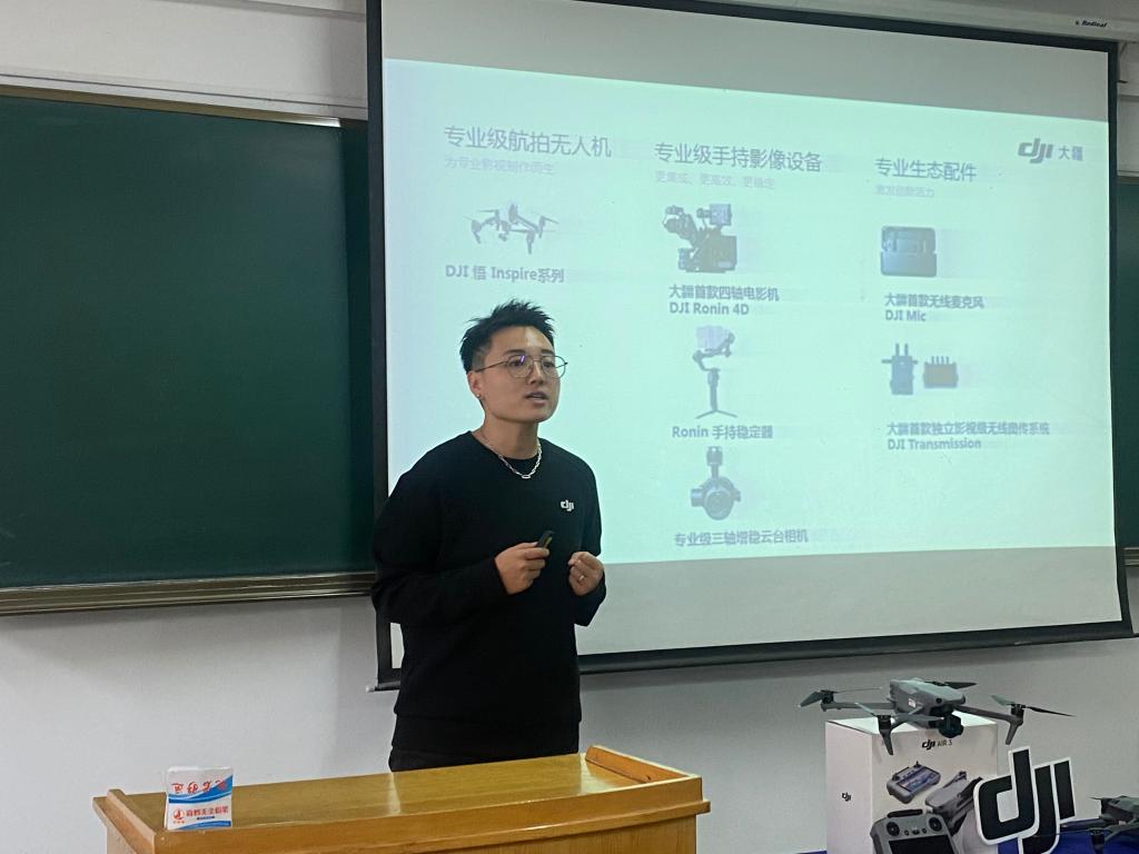 二位主讲人通过生动有趣的图片及案例,向学生讲解了大疆企业文化、无人机行业发展趋势、无人机影视摄像应用及无人机影视拍摄技巧,让学生们领略了科技给影视节目创作带来的巨大变化。在无人机飞行实操展示活动中,学生踊跃操作,现场活动氛围热烈。在此次讲座中,学生“零距离”接触了无人机行业最新技术、设备,开阔了眼界,丰富了专业知识和技能。