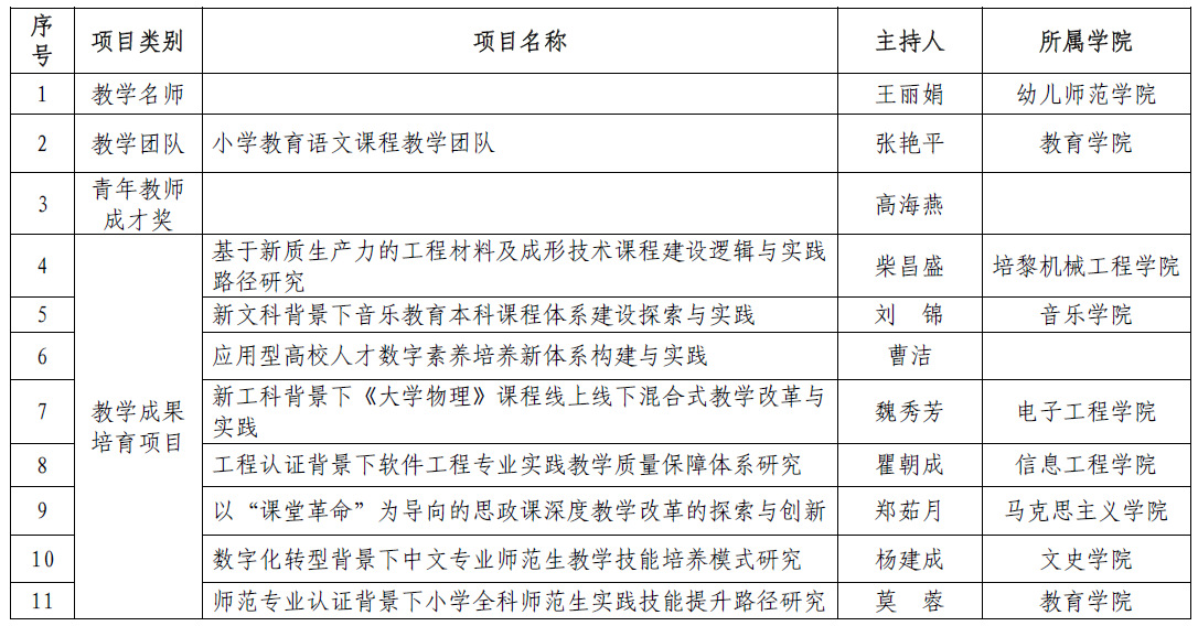 甘肃省高等学校人才培养质量提升项目中,获批省级教学名师1人,教学团队1个,青年教师成才奖1人,教学成果培育项目8项。