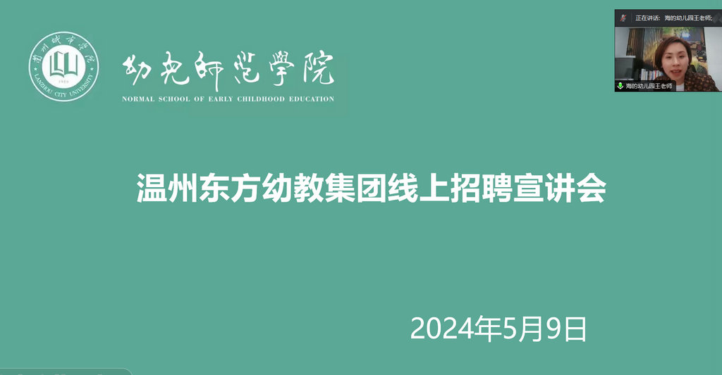 5月9日,幼儿师范学院邀请温州东方幼教集团开展线上专场招聘会,集团旗下海的幼儿园园长王丽丽应邀主讲,学院2024届学前教育专业毕业生近100人参加活动。
